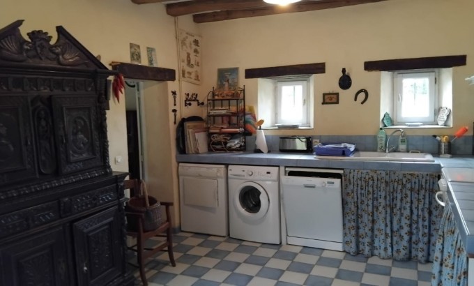 Cuisine familiale spacieuse, aménagée et équipée (four, lave-vaisselle, lave-linge, réfrigérateur, plans de travail carrelés et rangements)
