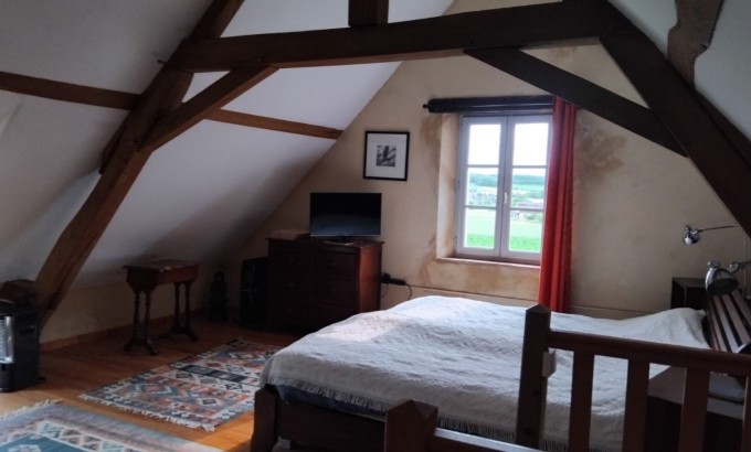 Grande chambre sous combles avec charpente apparente et vue dégagée