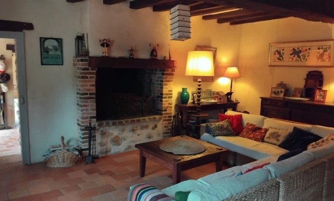 Salon chaleureux avec foyer ouvert, poutres apparentes et murs en pierre