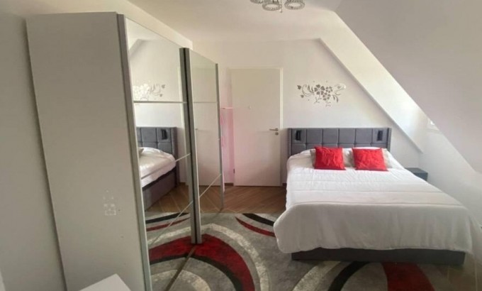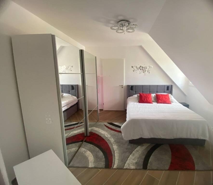 Mobilier neuf : 3 lits double (2 en 160x200, 1 en 140x200), tables de nuit, armoires, commode, canapé d'angle convertible, table basse, table à manger extensible avec 6 chaises, salon de jardin avec parasol lumineux