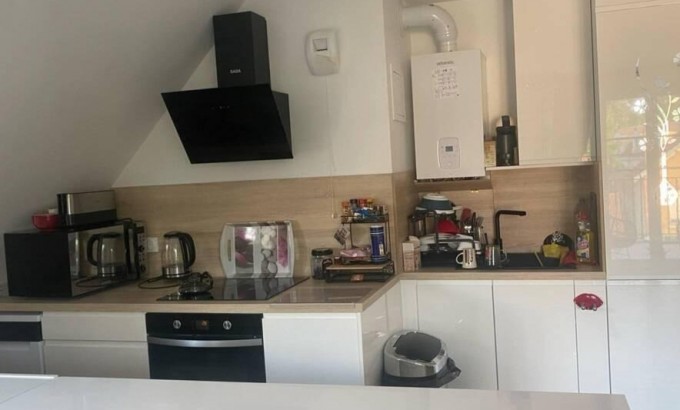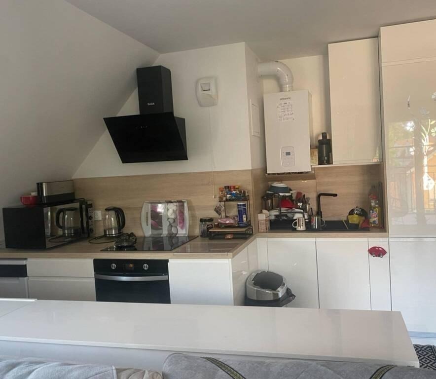 Cuisine équipée neuve : four, plaques, réfrigérateur encastré, lave-vaisselle, micro-ondes, grille-pain, chaudière gaz individuelle