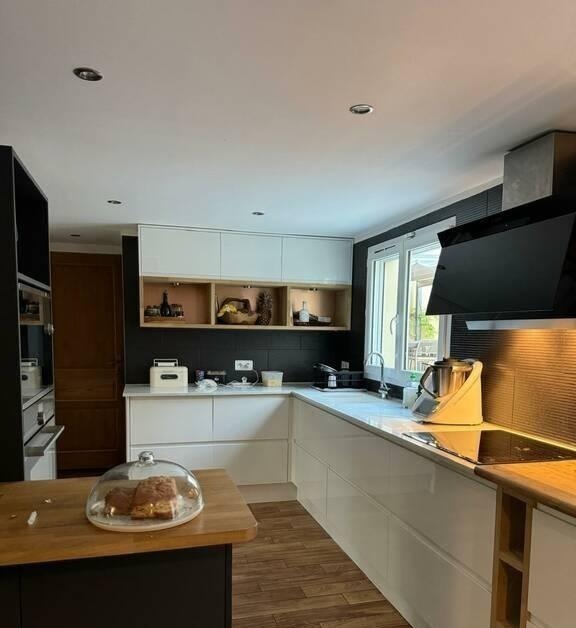 Cuisine ouverte récente sur mesure, en bois massif avec plan de travail en quartz, entièrement équipée