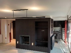 Un grand séjour double avec cheminée contemporaine intégrée dans un îlot central décoratif de rangements